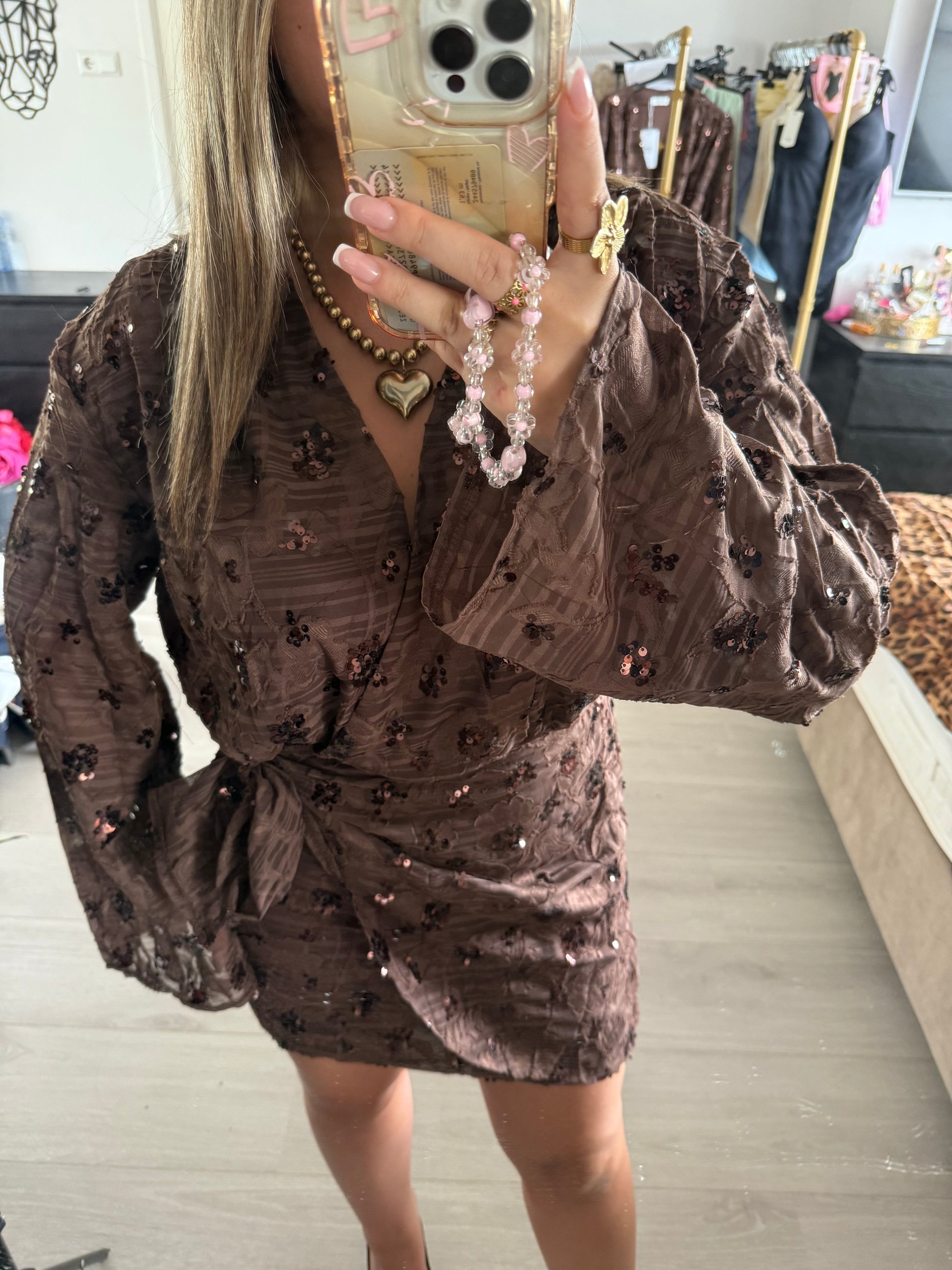Shine all night in onze viral Sequin Dream Dress! Dit jurkje heeft een luxe satijnlook met subtiele sequin details die het licht prachtig opvangen. Het model heeft een overslag met strikdetail en wijdere mouwen voor die effortless chic look.